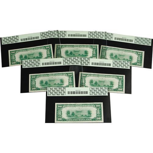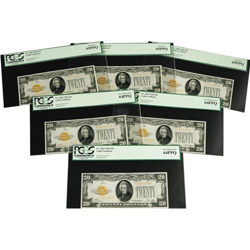 <B>Fr. 2402 $20 1928 Gold Certificates. Six Consecutive Examples. PCGS Very Choice New 64PPQ (3); Gem New 65PPQ (3).</B></I><BR>This is the first time that we have had such an especially nice run of $20 Gold notes. Ample margins, embossing, deep orange third printing, and natural paper wave are merits of each note. This is not a cut half sheet as the plate letters are B, C, D, E, F, and A. Multiples of this Friedberg number have been thoroughly dispersed over the years making this offering that much more special. A trivial spot is seen on the first note below the portrait.<BR><BR><b>Shipping:</b> Coins & Currency (<a target="_blank" href="http://www.heritageauctions.com/common/shipping.php">view shipping information</a>)
