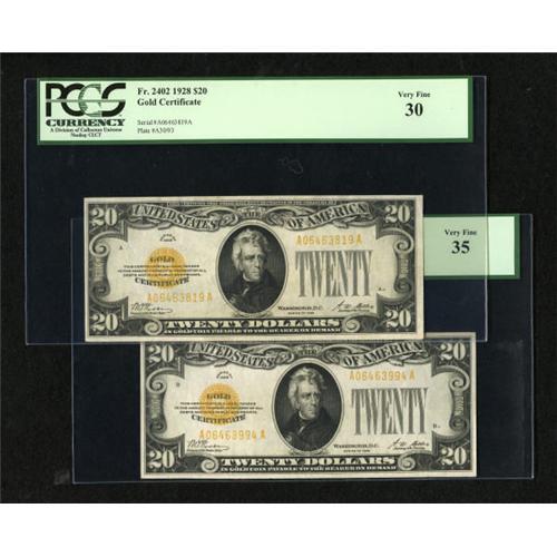 <B>Fr. 2402 Pair of $20 1928 Gold Certificates. PCGS Very Fine 30/35.</B></I><BR> An evenly matched pair of Gold Certificates that are both colorful and well margined. The second note graded PCGS 35 has a small rust stain in the top border but otherwise this pair is utterly problem free.<BR><BR><b>Shipping:</b> Coins & Currency (<a target="_blank" href="http://www.heritageauctions.com/common/shipping.php">view shipping information</a>)