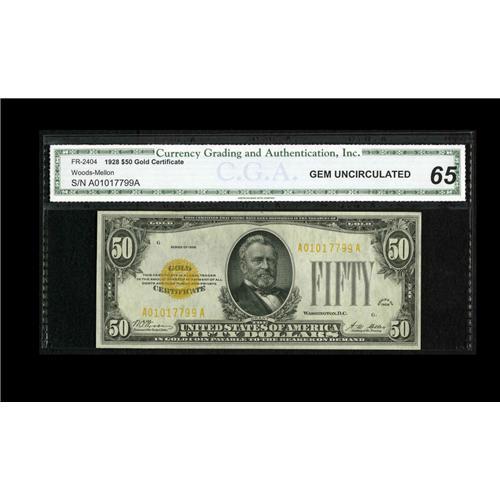 <B>Fr. 2404 $50 1928 Gold Certificate. CGA Gem Uncirculated 65.</B></I><BR>This certainly is a note worthy of interest as the strongly embossed surfaces are clearly visible. Kept from a higher grade by a tight right margin.