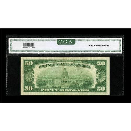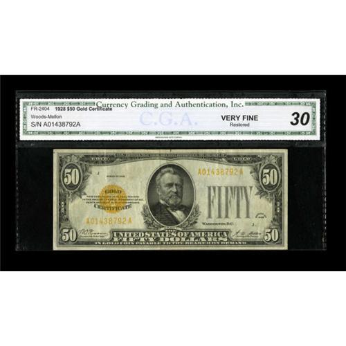 <B>Fr. 2404 $50 1928 Gold Certificate. CGA Very Fine 30.</B></I><BR> The lower left hand corner has been restored on this popular denomination.<BR><BR><b>Shipping:</b> Coins & Currency (<a target="_blank" href="http://www.heritageauctions.com/common/shipping.php">view shipping information</a>)