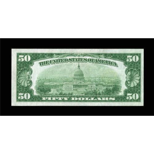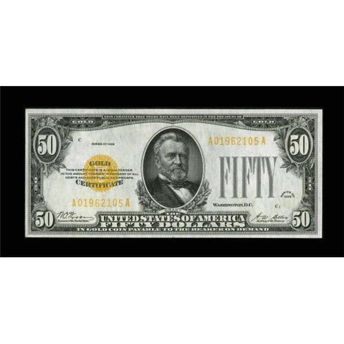 <B>Fr. 2404 $50 1928 Gold Certificate. Choice About Uncirculated.</B></I><BR> This note is well margined and quite bright. A very light center fold is noticed within the portrait area.<BR><BR><b>Shipping:</b> Coins & Currency (<a target="_blank" href="http://www.heritageauctions.com/common/shipping.php">view shipping information</a>)