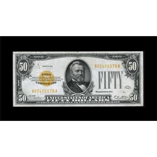 <B>Fr. 2404 $50 1928 Gold Certificate. Extremely Fine.</B></I><BR> Well centered but with a small paper clip mark on the front which has left just a trace of rust. <BR><BR><b>Shipping:</b> Coins & Currency (<a target="_blank" href="http://www.heritageauctions.com/common/shipping.php">view shipping information</a>)