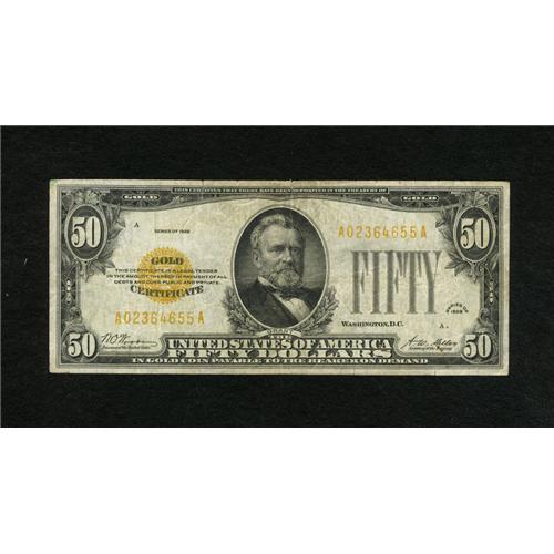 <B>Fr. 2404 $50 1928 Gold Certificate. Fine+.</B></I><BR>A little area of discoloration is noticed on the back. Despite the margin nicks this note faces up well.<BR><BR><b>Shipping:</b> Coins & Currency (<a target="_blank" href="http://www.heritageauctions.com/common/shipping.php">view shipping information</a>)