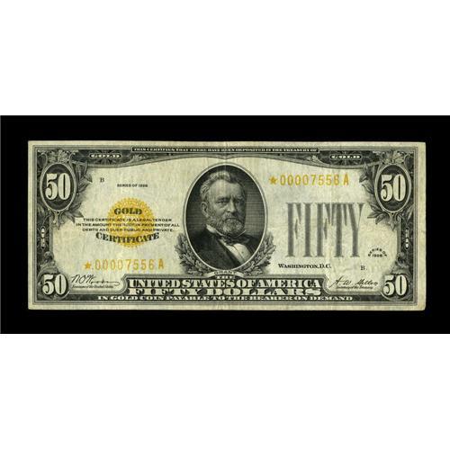 <B>Fr. 2404* $50 1928 Gold Certificate. Fine.</B></I><BR>This elusive star has serial number *00007556A. One small edge tear is noticed on this $50 that has the appearance of a higher grade at first glance.<BR><I>From The Bill and Kathy Stella Currency Collection</B></I><BR><BR><b>Shipping:</b> Coin/Currency (<a target="_blank" href="http://www.heritageauctions.com/common/shipping.php">view shipping information</a>)