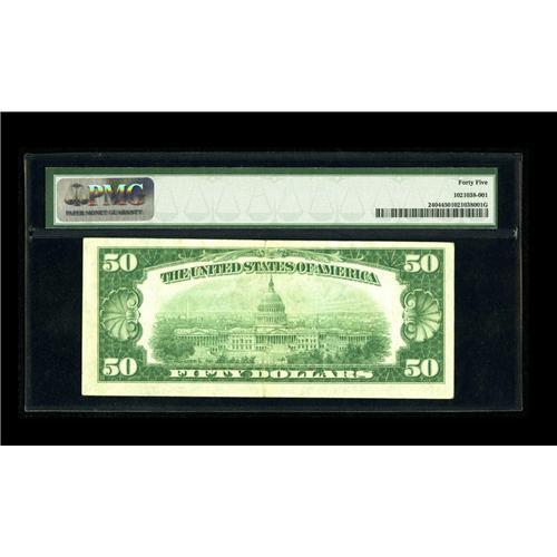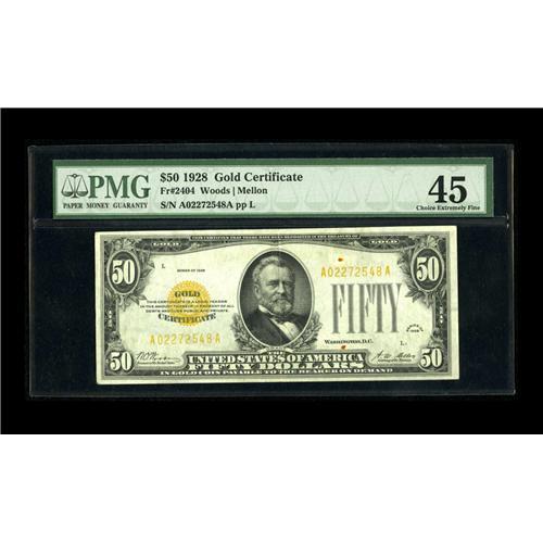 <B>Fr. 2404 $50 1928 Gold Certificate. PMG Choice Extremely Fine 45.</B></I><BR>Nice margins dominate this example with a couple of stray felt tip marks which can be seen beneath the holder of this popular issue $50 Gold Certificate.<BR><BR><b>Shipping:</b> Coin/Currency (<a target="_blank" href="http://www.heritageauctions.com/common/shipping.php">view shipping information</a>)