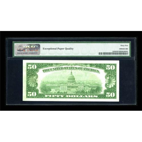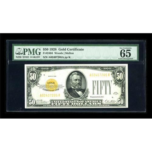 <B>Fr. 2404 $50 1928 Gold Certificate. PMG Gem Uncirculated 65 EPQ.</B></I><BR> Original paper waves are noted in the holder of this PMG Gem Uncirculated 65 note, which bears the coveted EPQ designation attesting to this specimen's originality. <BR><BR><b>Shipping:</b> Coins & Currency (<a target="_blank" href="http://www.heritageauctions.com/common/shipping.php">view shipping information</a>)