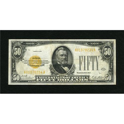 <B>Fr. 2404 $50 1928 Gold Certificate. Very Fine.</B></I><BR>A pleasing example which is colorful and blemish free.<BR><BR><b>Shipping:</b> Coins & Currency (<a target="_blank" href="http://www.heritageauctions.com/common/shipping.php">view shipping information</a>)