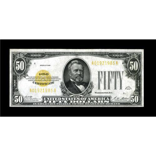 <B>Fr. 2404 $50 1928 Gold Certificate. Very Fine-Extremely Fine.</B></I><BR>The overprints on this note remain bold and the paper bright despite a touch of flatness.<BR><BR><b>Shipping:</b> Coins & Currency (<a target="_blank" href="http://www.heritageauctions.com/common/shipping.php">view shipping information</a>)