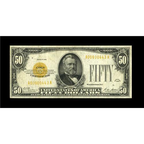 <B>Fr. 2404 $50 1928 Gold Certificate. Very Fine.</B></I><BR>This is a tough note in all grades, with this example exhibiting solid edges.<BR><BR><b>Shipping:</b> Coins & Currency (<a target="_blank" href="http://www.heritageauctions.com/common/shipping.php">view shipping information</a>)