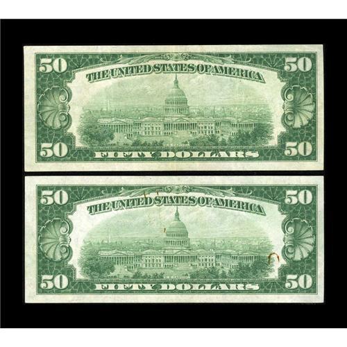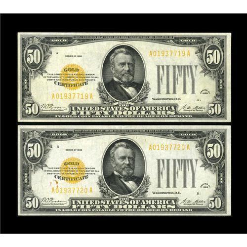 <B>Fr. 2404 $50 1928 Gold Certificates. Two Consecutive Examples.</B></I><BR>It is unusual to find consecutive notes of this design. The first note grades <B>VF</B></I> and has a paper clip indentation. The second note grades <B>XF</B></I> with a paper clip indentation plus two partial paper clip rust outlines. The paper clipping of these notes to a document probably accounts for their survival.<BR><BR><b>Shipping:</b> Coins & Currency (<a target="_blank" href="http://www.heritageauctions.com/common/shipping.php">view shipping information</a>)