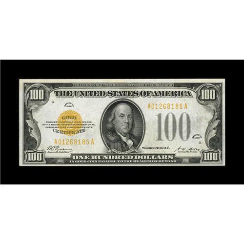 <B>Fr. 2405 $100 1928 Gold Certificate. About Uncirculated.</B></I><BR>Detailed examination of this boldly colored note reveals the slightest of horizontal bends. The margins are sufficient all around for a Choice grade.<BR><I>From The Bill and Kathy Stella Currency Collection</B></I><BR><BR><b>Shipping:</b> Coin/Currency (<a target="_blank" href="http://www.heritageauctions.com/common/shipping.php">view shipping information</a>)