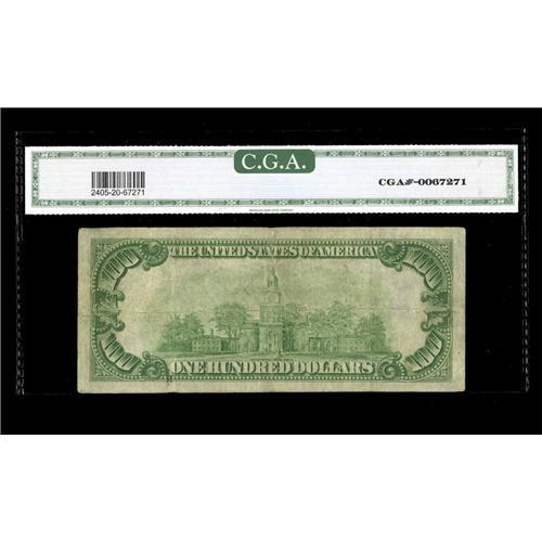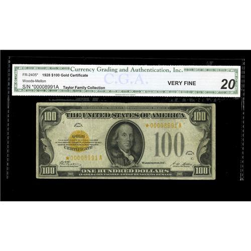 <B>Fr. 2405* $100 1928 Gold Certificate. CGA Very Fine 20.</B></I><BR>This CGA graded example of a very tough to find star traces its pedigree to the Taylor Family collection sale. The $100 Gold star is seldom available in any grade, with this only the fourth example in all grades combined we've had to offer in the past seven years.