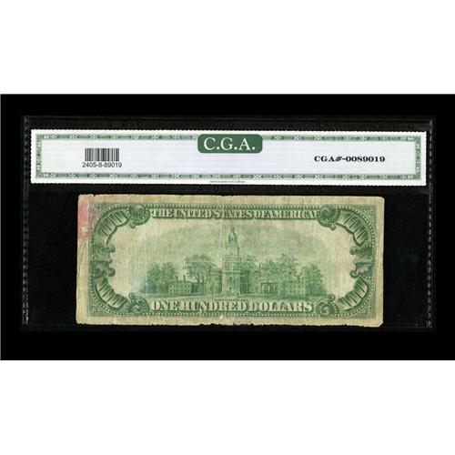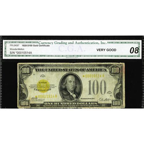 <B>Fr. 2405* $100 1928 Gold Certificate. CGA Very Good 08.</B></I><BR>From our FUN 2006 sale, the note has been encapsulated at the originally assigned grade. A rare replacement that had a production run of just 12,000 pieces.