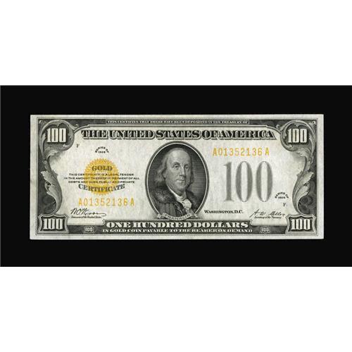 <B>Fr. 2405 $100 1928 Gold Certificate. Choice About Uncirculated.</B></I><BR>A light center fold is noted on this otherwise Gem looking Gold Certificate. The overprint is bright as is the paper.<BR><BR><b>Shipping:</b> Coins & Currency (<a target="_blank" href="http://www.heritageauctions.com/common/shipping.php">view shipping information</a>)