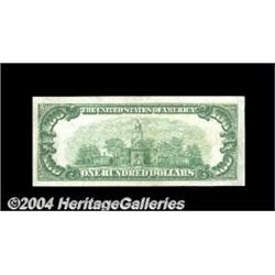 Fr. 2405 $100 1928 Gold Certificate. Choice About Uncirculated.A very high grade example with just the barest trace of a fold. <BR><BR><B>Important notice:</B> Heritage usually auctions material at the rate of 200-250 lots per hour. On some occasions eBay Live bid software or the Internet may not be able to keep up with the pace of the auction. We recommend placing a realistic absentee bid now as insurance to avoid disappointment. Occasionally the auctioneer may eliminate or reject an eBay Live bid, and the auctioneer may also reopen a lot after the close of the eBay live bidding (usually because we missed an audience bid), and may reject your bid even if it shows you as the winning bidder. By bidding via eBay Live, you agree that Heritage may award the lot to another bidder at its sole discretion under the circumstances described above or any other reasonable circumstances. Since eBay bids are not shown to us until we open the lot on the floor, we treat those bids just like floor bids. In most cases the floor responds before the eBay bid is presented to us, due to Internet lag time, so for consistency we have made it a policy that floor bids are always considered first over tie eBay live bids. Also please note that all Heritage lots purchased through eBay Live carry a 20% Buyer's Premium. Please make sure you read the Terms and Conditions before you bid. <BR><BR><B>IMPORTANT ANNOUNCEMENT ABOUT RESERVES:</B> Heritage now divulges all reserves on its web site 7 days before every auction. If you want to know whether the reserve on this lot has been met, and if not, what the reserve amount is, please visit this lot page on the HeritageCoin.com web site, or email: bid@HeritageGalleries.com