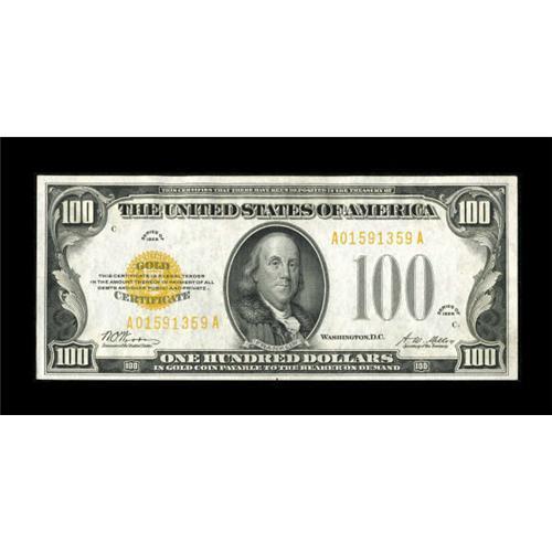 <B>Fr. 2405 $100 1928 Gold Certificate. Choice About Uncirculated.</B></I><BR> A soft center bend is noticed on this otherwise original, strongly embossed note. Many might call this uncirculated, but the paper doesn't lie. <BR><BR><b>Shipping:</b> Coins & Currency (<a target="_blank" href="http://www.heritageauctions.com/common/shipping.php">view shipping information</a>)