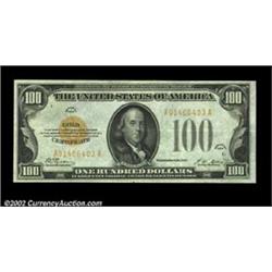 Fr. 2405 $100 1928 Gold Certificate. Extremely Fine-About Uncirculated.A very nice high end piece which is better centered than most for this issue. Important notice: We expect to be auctioning lots at the rate of 200-250 per hour. Sometimes eBay Premier live bid software cannot keep up with that pace, so we strongly recommend that you place a realistic proxy bid now as insurance to avoid disappointment. Also please note that all Heritage/CAA lots purchased through eBay Premier carry a 20% Buyer's Premium. Please make sure you read the Terms and Conditions.