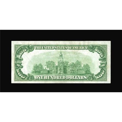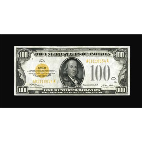 <B>Fr. 2405 $100 1928 Gold Certificate. Extremely Fine-About Uncirculated.</B></I><BR> A bright example with great color and eye appeal, typical of the old time quality of John Ameen's notes. There is one center fold and some light handling, but overall this piece is far prettier than many notes described as uncirculated. <BR><I>From The John Ameen Collection</B></I><BR><BR><b>Shipping:</b> Coins & Currency (<a target="_blank" href="http://www.heritageauctions.com/common/shipping.php">view shipping information</a>)