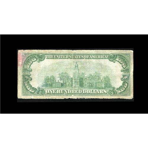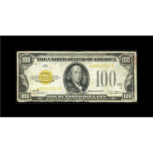 <B>Fr. 2405* $100 1928 Gold Certificate. Very Good.</B></I><BR>A well circulated example of this very scarce high denomination Gold star, which had a production run of just 12,000 pieces. There is a small stain at the top right and a bit of margin fraying.