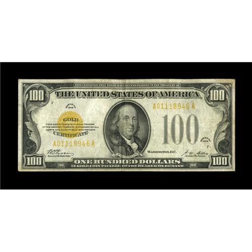 <B>Fr. 2405 $100 1928 Gold Certificate. Fine+.</B></I><BR>The edges and overprint are nice for the grade on this $100 Gold. The upper right corner has a small moisture spot. A tiny spot is seen on the back, too.<BR><BR><b>Shipping:</b> Coins & Currency (<a target="_blank" href="http://www.heritageauctions.com/common/shipping.php">view shipping information</a>)