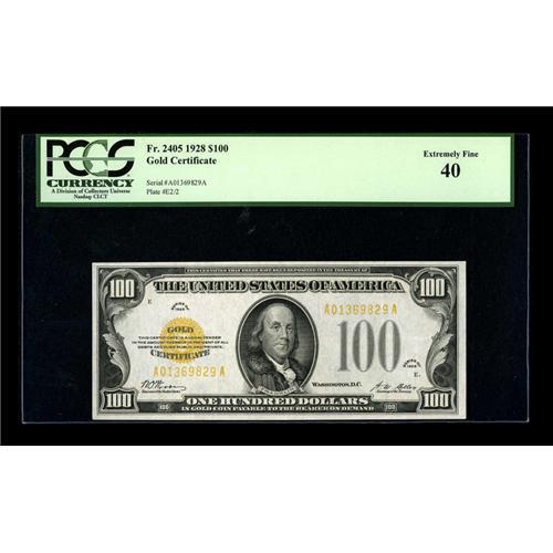 <B>Fr. 2405 $100 1928 Gold Certificate. PCGS Extremely Fine 40.</B></I><BR>Bountiful margins and bright ink colors are seen on this lightly circulated Gold note. Higher denomination Gold Certificates are more popular than ever and are bringing very strong prices at auction.<BR><BR><b>Shipping:</b> Coins & Currency (<a target="_blank" href="http://www.heritageauctions.com/common/shipping.php">view shipping information</a>)