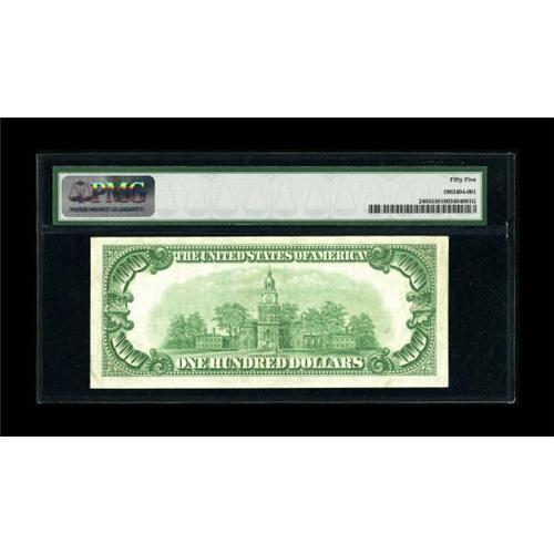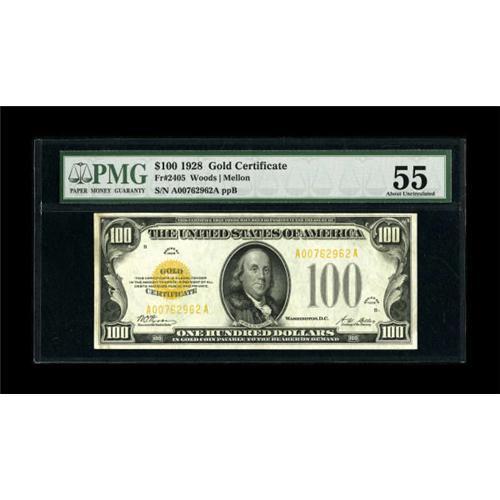 <B>Fr. 2405 $100 1928 Gold Certificate. PMG About Uncirculated 55.</B></I><BR> This gold seal is well centered and displays bright colors.<BR><BR><b>Shipping:</b> Coins & Currency (<a target="_blank" href="http://www.heritageauctions.com/common/shipping.php">view shipping information</a>)