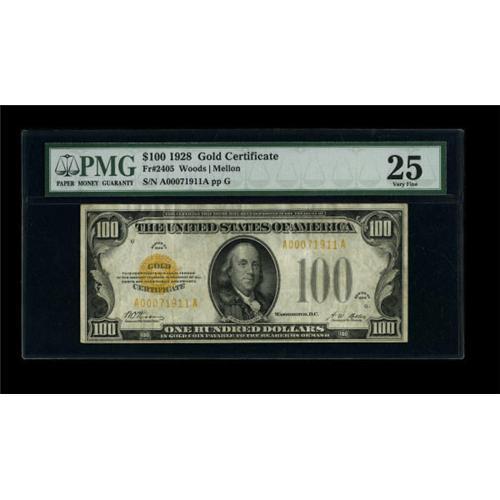 <B>Fr. 2405 $100 1928 Gold Certificate. PMG Very Fine 25.</B></I><BR> Bright colors abound on this evenly circulated high denomination gold note.<BR><BR><b>Shipping:</b> Coins & Currency (<a target="_blank" href="http://www.heritageauctions.com/common/shipping.php">view shipping information</a>)