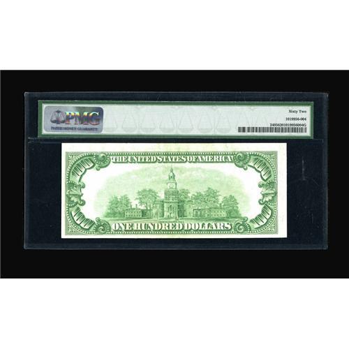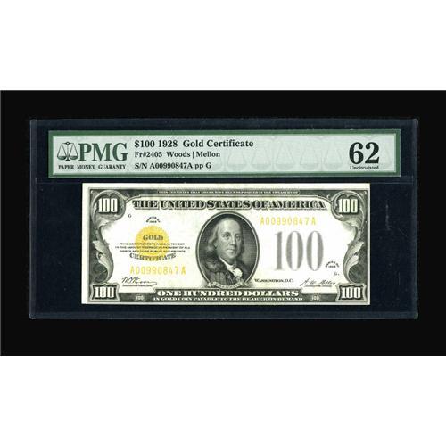 <B>Fr. 2405 $100 1928 Gold Certificate. PMG Uncirculated 62.</B></I><BR>The overprint and paper quality are suggestive of a Choice grade, though the bottom margin is a little tight.<BR><BR><b>Shipping:</b> Coins & Currency (<a target="_blank" href="http://www.heritageauctions.com/common/shipping.php">view shipping information</a>)