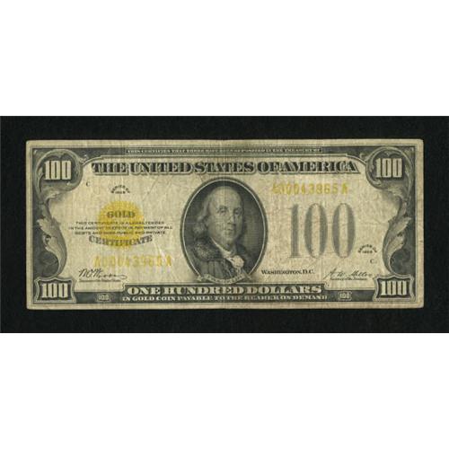 <B>Fr. 2405 $100 1928 Gold Certificate. Very Good.</B></I><BR> While well circulated, this $100 Gold is nicely centered and has no problems for the grade except for a couple of pinholes.<BR><BR><b>Shipping:</b> Coins & Currency (<a target="_blank" href="http://www.heritageauctions.com/common/shipping.php">view shipping information</a>)