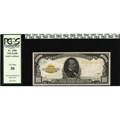 <B>Fr. 2408 $1000 1928 Gold Certificate. PCGS Very Fine 30.</B></I><BR>A nice evenly circulated example that may be acquired tonight for around ten times face.