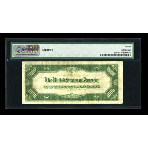 <B>Fr. 2408 $1000 1928 Gold Certificate. PMG Choice Fine 15 Net.</B></I><BR> PMG indicates "Repaired" on the holder. While certainly accurate, the repair affects only a corner tip. The remainder of the note is unmolested with pleasing originality and a solid overprint.<BR><BR><b>Shipping:</b> Coins & Currency (<a target="_blank" href="http://www.heritageauctions.com/common/shipping.php">view shipping information</a>)