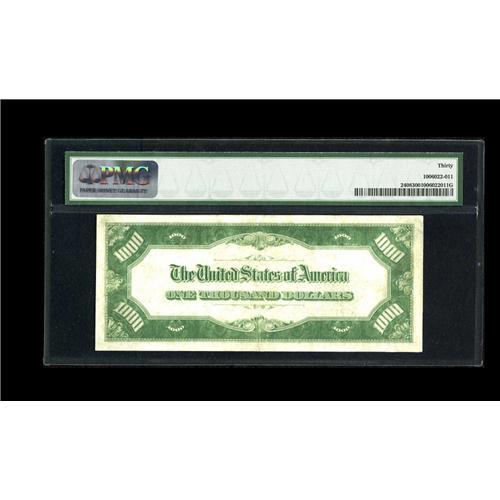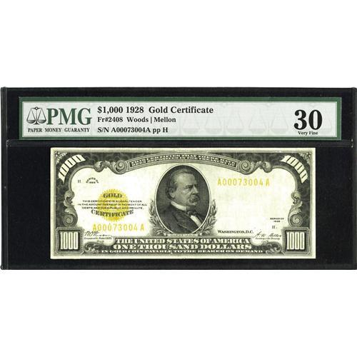 <B>Fr. 2408 $1000 1928 Gold Certificate. PMG Very Fine 30.</B></I><BR>After several auctions with a dry spell for this scarce issue, we have hit the jackpot as this is one of several Gold Certificates. A nice circulated note that remains colorful although a few pinholes can be seen.