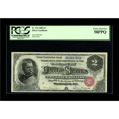 <B>Fr. 241 $2 1886 Silver Certificate PCGS Choice About New 58PPQ.</B></I> This note appears in the Gengerke census as CU, though a soft corner fold has removed it from that grade level. Certainly a note which will be stretched for because all the other qualities for a New note exist. Sure to end in the area of...<BR><BR><b>Shipping:</b> Coin/Currency (<a target="_blank" href="http://www.heritageauctions.com/common/shipping.php">view shipping information</a>)