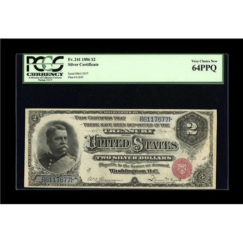 <B>Fr. 241 $2 1886 Silver Certificate PCGS Very Choice New 64PPQ.</B></I> This small seal Hancock deuce boasts margins sufficient for Gem. The paper is wholly original and problem free.<BR><BR><b>Shipping:</b> Coin/Currency (<a target="_blank" href="http://www.heritageauctions.com/common/shipping.php">view shipping information</a>)