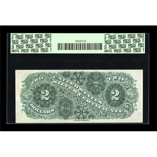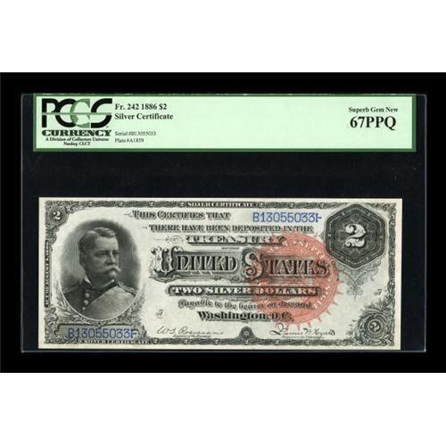 <B>Fr. 242 $2 1886 Silver Certificate PCGS Superb Gem New 67PPQ.</B></I> A real standout of a Hancock Deuce, with huge, even margins, ideal centering of both sides, deep original embossing and the boldest, most perfect colors that anyone could ever hope for. This type does come nice, and we've handled a number of Superb pieces, but none were markedly superior to this flashy beauty. We sold a piece just a touch better, a PCGS 68, in April 2006 for $18,400. This note will not quite reach that level, but it may well take a run at it. <BR><BR><b>Shipping:</b> Coins & Currency (<a target="_blank" href="http://www.heritageauctions.com/common/shipping.php">view shipping information</a>)