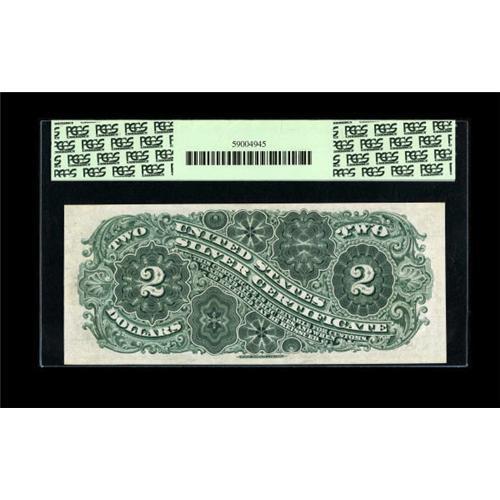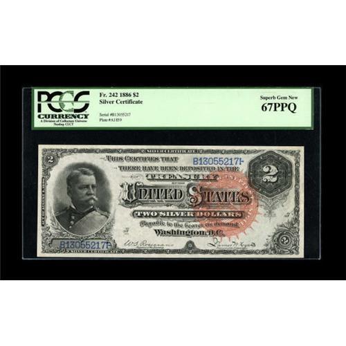 <B>Fr. 242 $2 1886 Silver Certificate PCGS Superb Gem New 67PPQ.</B></I> A real standout of a Hancock Deuce, with huge, even margins, ideal centering of both sides, deep original embossing and the boldest, most perfect colors that anyone could ever hope for. This type does come nice, and we've handled a number of Superb pieces, but none were markedly superior to this flashy beauty. We sold a piece just a touch better, a PCGS 68, in April 2006 for $18,400. This note will not quite reach that level, but it may well take a run at it. <BR><BR><b>Shipping:</b> Coins & Currency (<a target="_blank" href="http://www.heritageauctions.com/common/shipping.php">view shipping information</a>)