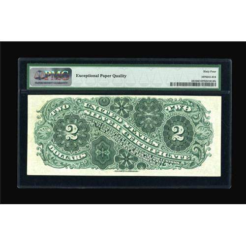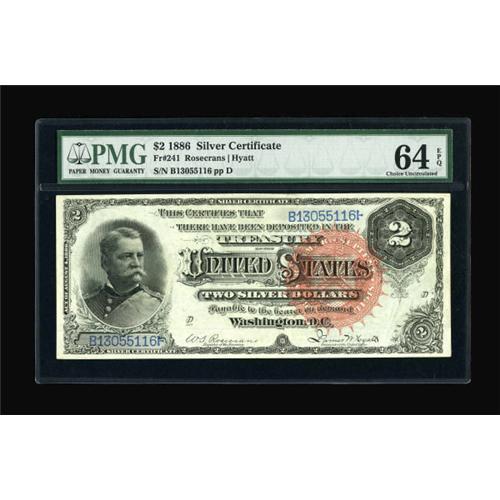 <B>Fr. 242 $2 1886 Silver Certificate PMG Choice Uncirculated 64 EPQ.</B></I> This wonderfully original Hancock remains attractive and bright. Overall, the eye appeal is most pleasing with nice margins noticed. A little better back centering would have locked in the Gem designation.<BR><I>From The Warren Marshall Collection</B></I><BR><BR><b>Shipping:</b> Coins & Currency (<a target="_blank" href="http://www.heritageauctions.com/common/shipping.php">view shipping information</a>)