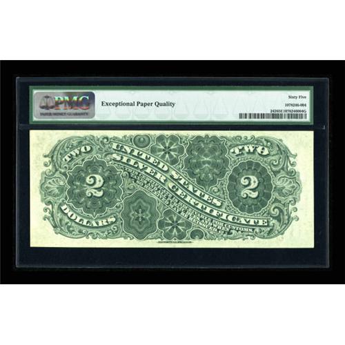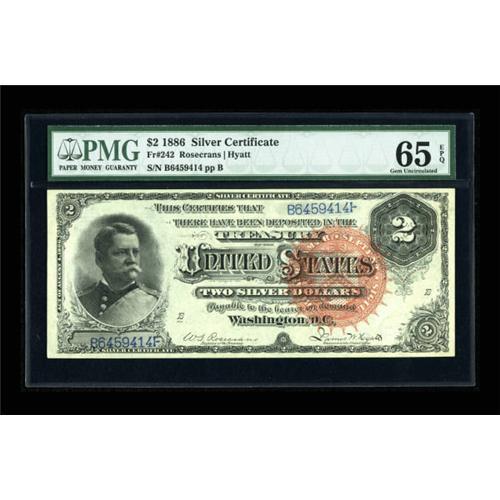 <B>Fr. 242 $2 1886 Silver Certificate PMG Gem Uncirculated 65 EPQ.</B></I> A brightly colored example with clearly evident paper originality and excellent eye appeal. A most attractive example of this always-popular "Mustache Note," featuring the portrait of Civil War General Winfield Scott Hancock. <BR><I>From The John Ameen Collection</B></I><BR><BR><b>Shipping:</b> Coins & Currency (<a target="_blank" href="http://www.heritageauctions.com/common/shipping.php">view shipping information</a>)