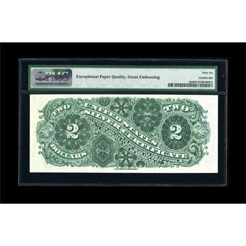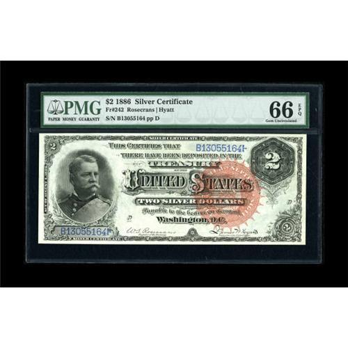 <B>Fr. 242 $2 1886 Silver Certificate PMG Gem Uncirculated 66 EPQ.</B></I> The surfaces on this Hancock are pleasingly original and the ink color is bright. Large margins complete this strongly embossed type note.<BR><BR><b>Shipping:</b> Coins & Currency (<a target="_blank" href="http://www.heritageauctions.com/common/shipping.php">view shipping information</a>)