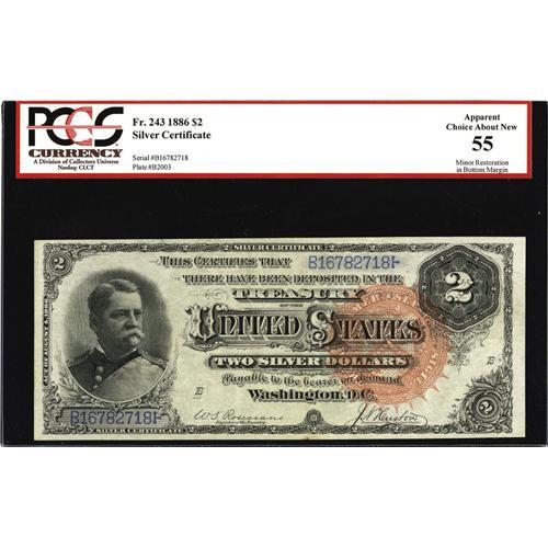 <B>Fr. 243 $2 1886 Silver Certificate PCGS Apparent Choice About New 55.</B></I> Red holdered by PCGS due to a minor margin restoration. Otherwise the surfaces are bright, well embossed and totally original. Expect to see some spirited bidding on this note before the night is done.