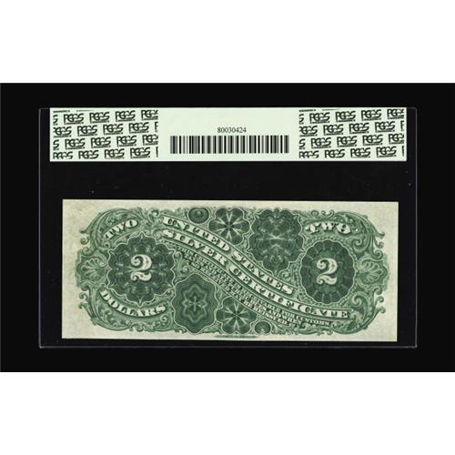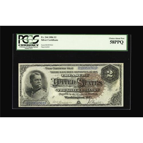 <B>Fr. 244 $2 1886 Silver Certificate PCGS Choice About New 58PPQ.</B></I> A slight corner bend and minor handling at upper right have taken this note from the Gem grade. All other surface components remain intact and this becomes one of those notes that will be stretched for due to its unmistakable quality.