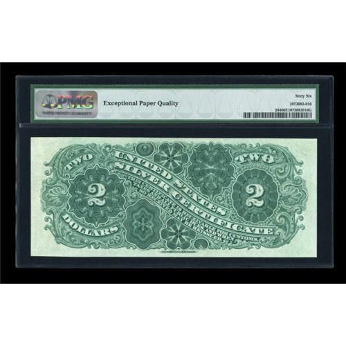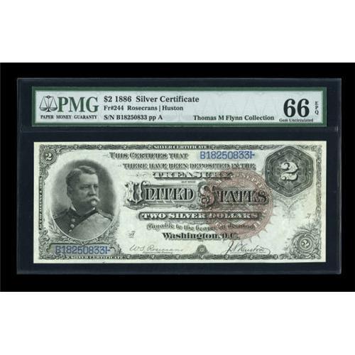 <B>Fr. 244 $2 1886 Silver Certificate PMG Gem Uncirculated 66 EPQ.</B></I> This Large Brown Seal Hancock Deuce is a much scarcer Friedberg number, particularly so in high grade. PMG has graded 39 Fr. 242's - the Hancock Deuce with the large red seal - at 65 and above, and only four Fr. 244's at that level. This note is tied with one other 66E for the finest yet graded. There are two 65E's directly below them. Rarity and grade seldom combine in the so-called Personality types, but this Large Brown Seal Deuce is a wonderful synergy of just that: quality and rarity. The margins are huge, the color absolutely ideal, and the note bears the important PMG accolade, "Exceptional Paper Quality."<BR><I>From The Thomas M. Flynn Collection</B></I><BR><BR><b>Shipping:</b> Coins & Currency (<a target="_blank" href="http://www.heritageauctions.com/common/shipping.php">view shipping information</a>)