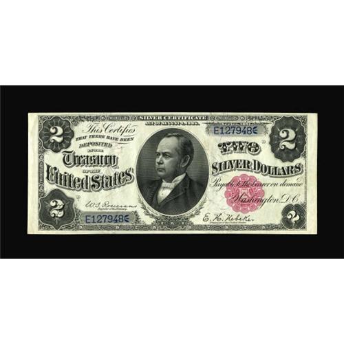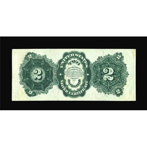 <B>Fr. 245 $2 1891 Silver Certificate Choice About New.</B></I> Save for a broad corner fold at the upper left, this Windom Deuce is a real Gem. It has excellent centering, including the ultra-wide side margins that are occasionally seen on this type. The note also has all its original paper surfaces, including deep serial number embossing. The colors are perfect, and the eye appeal is equal to that found on full Gem examples.<BR><BR><b>Shipping:</b> Coins & Currency (<a target="_blank" href="http://www.heritageauctions.com/common/shipping.php">view shipping information</a>)