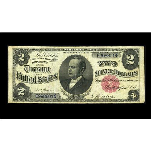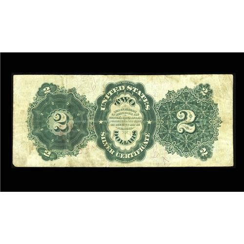 <B>Fr. 245 $2 1891 Silver Certificate Very Fine.</B></I> This Windom Deuce has rounded corners, but the margins are so huge that they are of very little consequence. There is also a scattering of light stains that are mainly visible on the back, but with the strong ink colors of this note, the visibility of the stains is pushed to the background. On balance, this is quite a nice circulated note.<BR><I>From The Ross Bailey Collection</B></I>