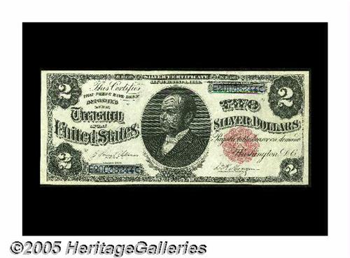 <B>Fr. 246 $2 1891 Silver Certificate Extremely Fine.</B></I> This nice Windom is broadly margined, with strong colors and good eye appeal. There are a few minor brown spots in one small area of the back, but they are the only detractions on an otherwise strikingly good-looking example of this popular and rather scarce type.