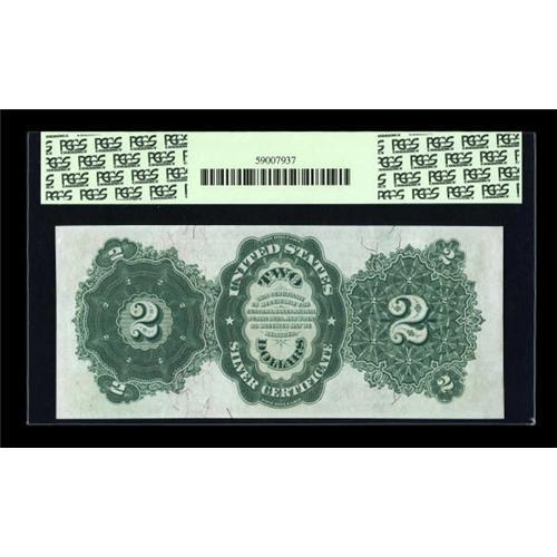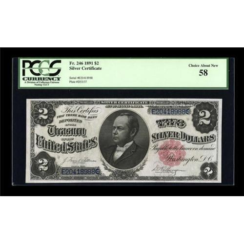 <B>Fr. 246 $2 1891 Silver Certificate PCGS Choice About New 58.</B></I> The color and margins are spectacular on this Windom. It is difficult to determine what type of handling led to the grade PCGS has assigned. All the qualities of a Gem appear to be present at only one-quarter the price.<BR><BR><b>Shipping:</b> Coins & Currency (<a target="_blank" href="http://www.heritageauctions.com/common/shipping.php">view shipping information</a>)