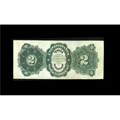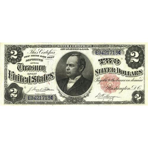 <B>Fr. 246 $2 1891 Silver Certificate Very Fine.</B></I> The colors on both sides are pleasing and the reinforced centerfold well disguised in Windom's hair.