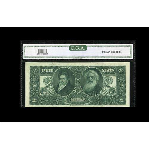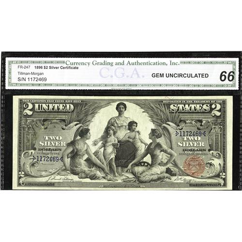 <B>Fr. 247 $2 1896 Silver Certificate CGA Gem Uncirculated 66.</B></I> Excellent print quality, embossing, natural surfaces, and margins on this example of this ever-popular design.