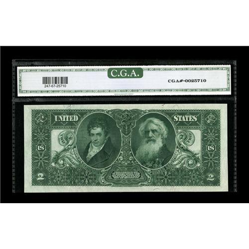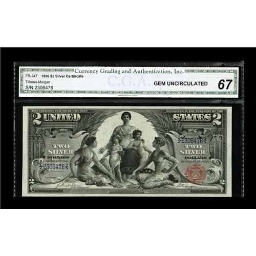 <B>Fr. 247 $2 1896 Silver Certificate CGA Gem Uncirculated 67.</B></I> This CGA graded Two Dollar Educational has boardwalk margins all the way around and virtually perfect centering of both sides. The broad, clean margins serve to accentuate the lovely colors of this popular design type.<BR><BR><b>Shipping:</b> Coin/Currency (<a target="_blank" href="http://www.heritageauctions.com/common/shipping.php">view shipping information</a>)