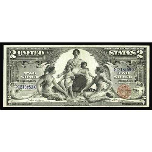 <B>Fr. 247 $2 1896 Silver Certificate Extremely Fine-About New.</B></I> Three folds are noted on this Educational Deuce. The wide margins and vivid color are unhindered by the flatness.
